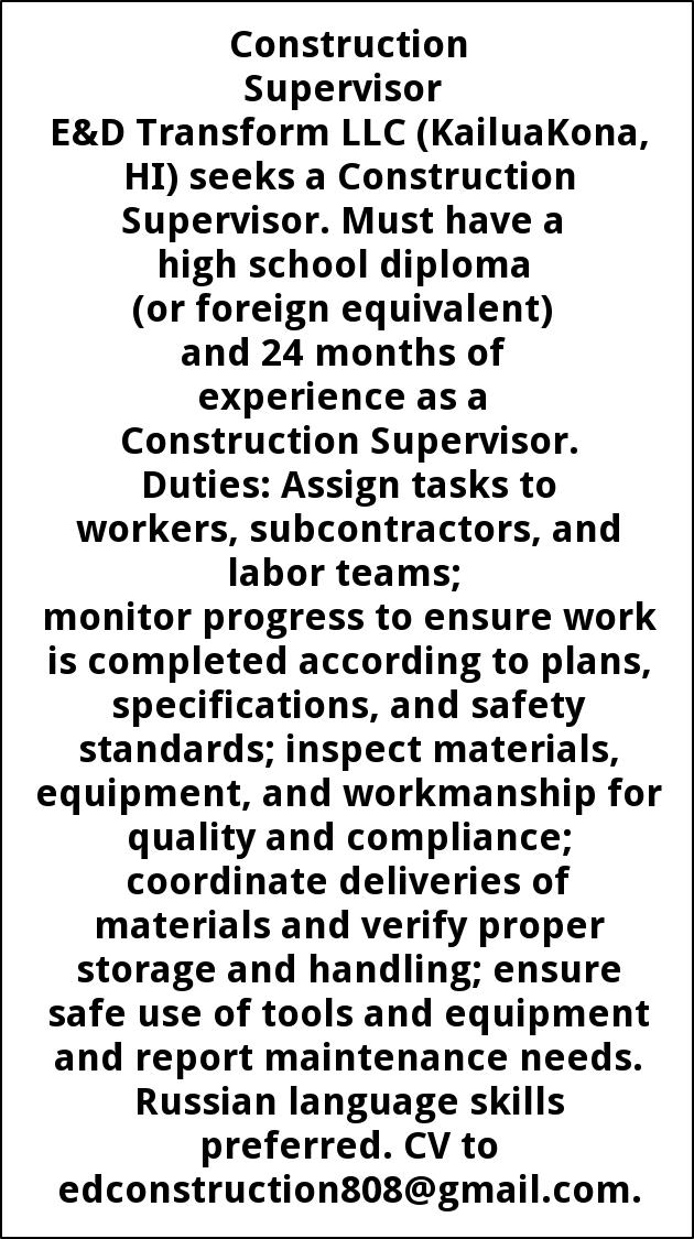 E&D Transform LLC (KailuaKona, HI) seeks a Construction Supervisor. Must have a
